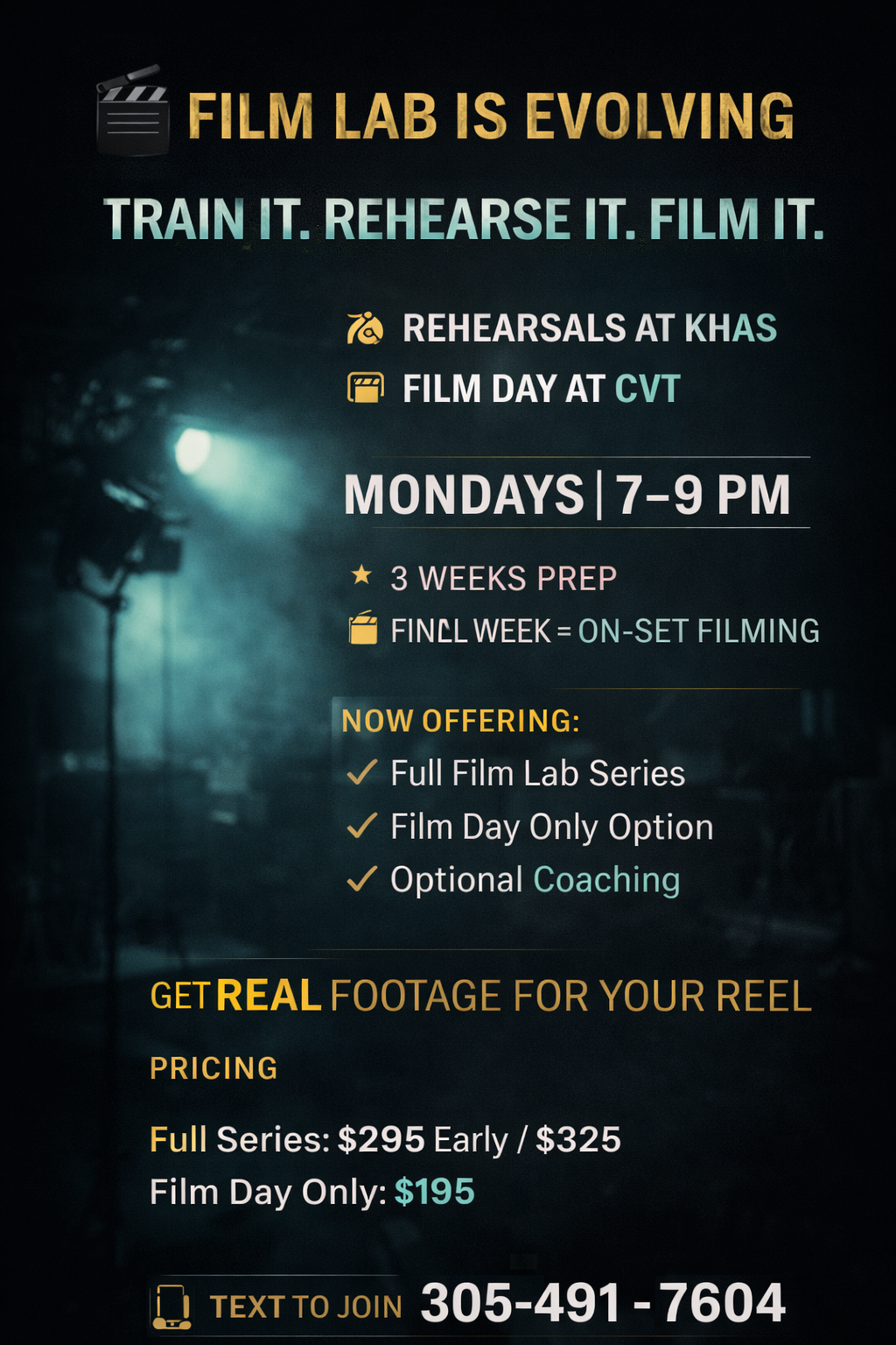 The KHAS Film Lab is a monthly on-camera program built around one goal: preparing and filming a focused demo scene. During the first three Mondays, actors explore the scene, discuss character choices, wardrobe, tone, and visual style, and rehearse with camera awareness in mind. On the final Monday, actors head to CVT for Film Day, where the scene is filmed with a more professional setup designed to support strong, usable footage. Actors may join the full series for guided preparation and a Film Day discount, or sign up for Film Day only and rehearse independently, with optional private coaching available on Zoom or in person.
